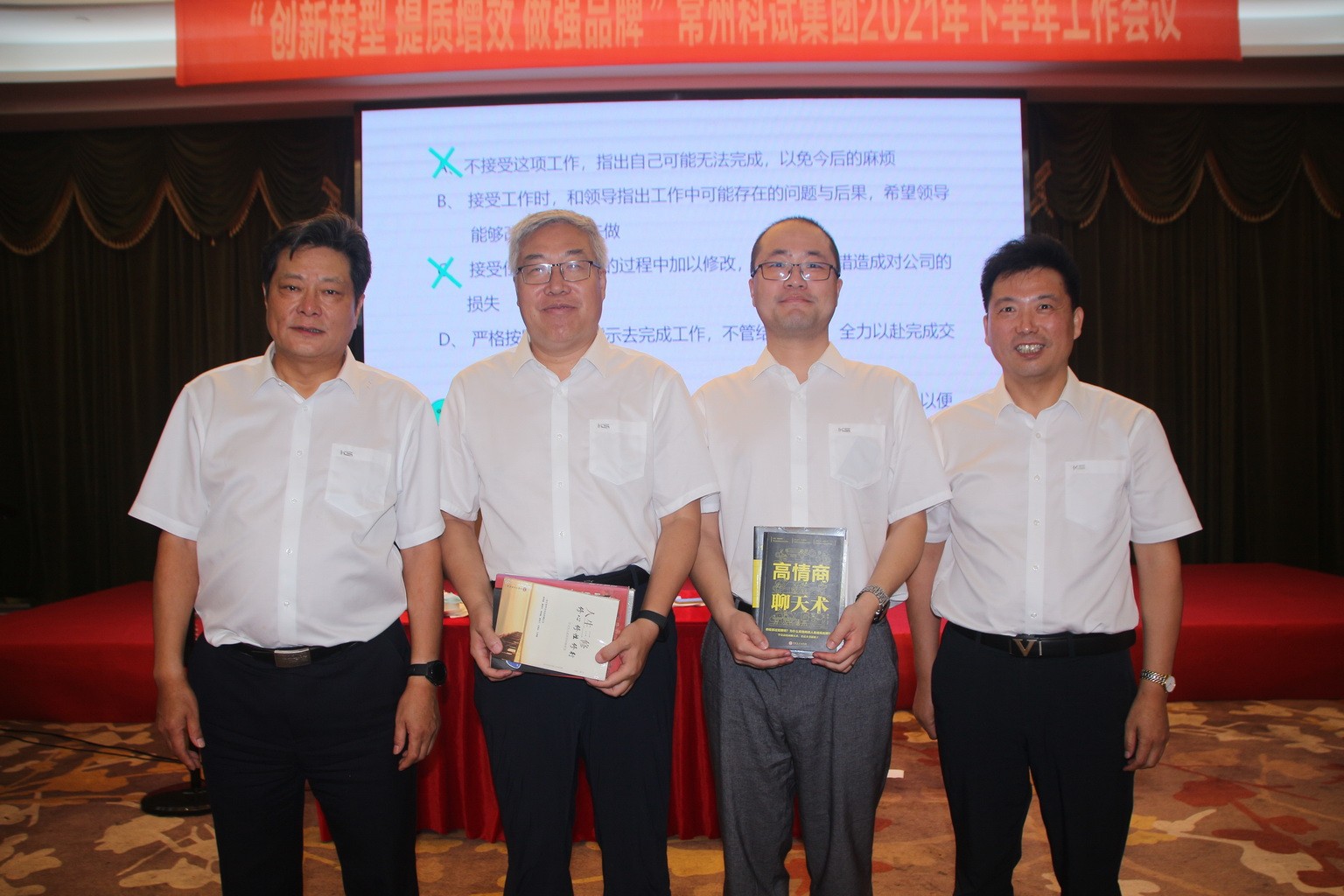 7月22日~25日,常州科試集團2021年下半年工作會議在安徽池州隆重召開,總裁姜漢軍、副總裁王眉林、關金學、顧祖全等公司全體中高層管理者共66人出席了會議。會議的主要內容是總結2021年上半年工作,分析當前企業內外經營形勢,并對下半年經營發展的目標及重點工作作出安排部署。